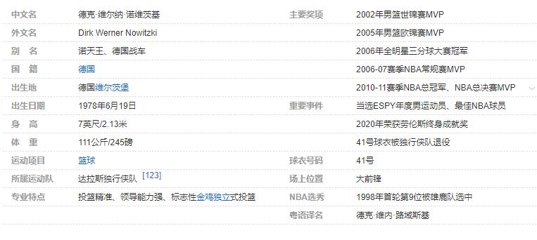 德克·诺维茨基(Dirk Nowitzki),1978年6月19日出生于德国维尔茨堡,德国职业篮球运动员,司职大前锋,绰号“诺天王”/“德国战车”,现任FIBA球员委员会主席以及达拉斯独行侠队顾问,是公认的继拉里·伯德之后顶尖的白人球星。个人简介: