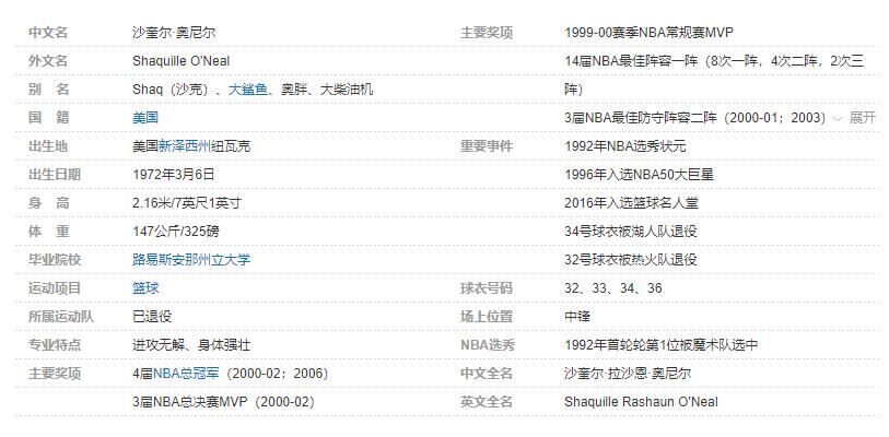 沙奎尔-奥尼尔个人详细资料简介:
