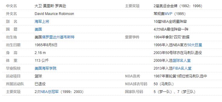 大卫·罗宾逊(David Robinson),1965年8月6日出生于美国佛罗里达州基韦斯特,前美国职业篮球运动员,司职中锋。个人简介:
