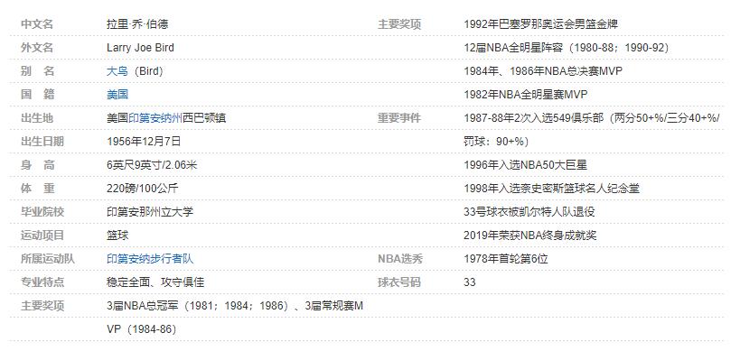 拉里·伯德(Larry Bird),1956年12月7日出生于美国印第安纳州西巴顿镇,前美国职业篮球运动员,司职小前锋/大前锋,绰号“大鸟”(Bird),现任印第安纳步行者队总经理 。个人简介: