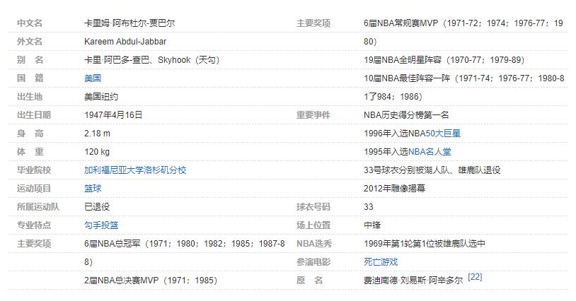 卡里姆·阿布杜尔-贾巴尔(Kareem Abdul-Jabbar),原名小费迪南德·刘易斯·阿辛多尔(Ferdinand Lewis Alcindor,Jr.), 1947年4月16日出生于美国纽约,前美国职业篮球运动员,司职中锋,绰号“天勾”(Skyhook)。个人简介: