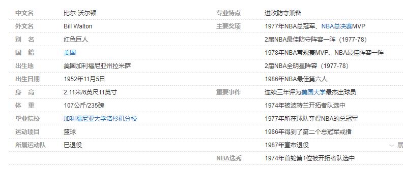 比尔·沃尔顿(Bill Walton),1952年11月5日出生于美国加利福尼亚州拉米萨(La Mesa,California),前美国职业篮球运动员,司职中锋,绰号“红色巨人”。个人简介: