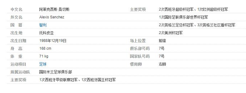 阿莱克西斯-桑切斯(Alexis Sanchez),1988年12月19日出生于智利的托科皮亚,智利足球运动员,场上司职前锋,效力于意甲国际米兰足球俱乐部。