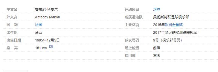 安东尼-马夏尔(Anthony Martial),1995年12月5日出生于法国埃松省的马西市, [1-2] 法国男子职业足球运动员, [3] 场上司职前锋,效力于英超曼彻斯特联足球俱乐部。个人简介: