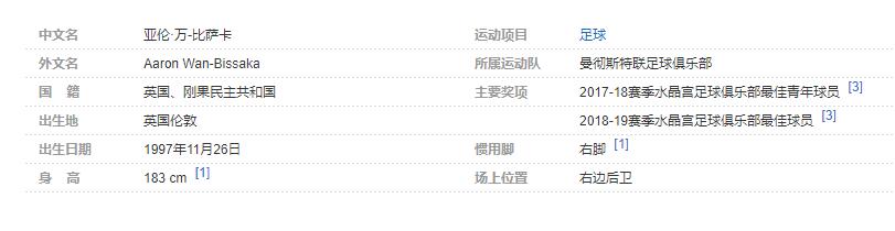 亚伦·万-比萨卡(Aaron Wan-Bissaka),1997年11月26日出生于英国伦敦,拥有英国/刚果民主共和国双重国籍,英国职业足球运动员,司职右边后卫,效力于英超曼彻斯特联足球俱乐部。个人简介: