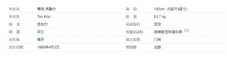 蒂姆·克鲁尔(Tim Krul),1988年4月3日出生于海牙,荷兰足球运动员,司职门将。早在1996年就加入了海牙青训,2005年转投纽卡斯尔联的青训系统。这位荷兰前国门在各项赛事为纽卡斯尔联出场过157次,被租借给过福尔柯克、卡莱尔联、阿贾克斯和阿尔克马尔。2017年8月从纽卡斯尔联加盟布莱顿,2018年自由转会加盟英冠诺维奇俱乐部。个人简介: