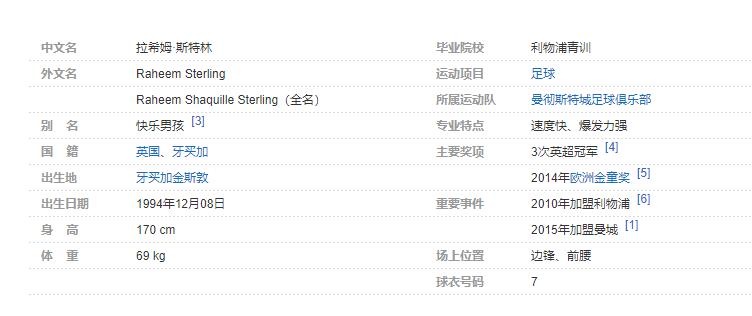 拉希姆·斯特林(Raheem Sterling),1994年12月8日出生于牙买加金斯敦,拥有英国和牙买加双重国籍,英格兰足球运动员,场上司职边锋或前腰,曾效力于女王公园巡游者足球俱乐部和利物浦足球俱乐部 [1] ,现效力于英超联赛的曼彻斯特城足球俱乐部。个人简介: