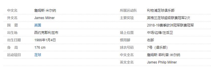 詹姆斯·米尔纳(James Milner),全名詹姆斯·菲利普·米尔纳(James Philip Milner),1986年1月4日出生于英国西约克郡利兹市,英国男子职业足球运动员,场上司职中场/边锋/左后卫, 效力于英超利物浦足球俱乐部。个人简介: