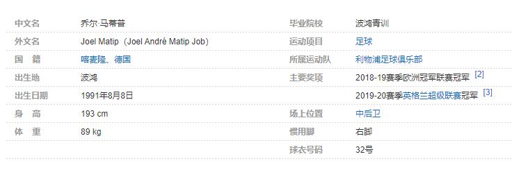 乔尔·马蒂普(Joel Matip),全名乔尔·安德烈·马蒂普·乔布(Joel André Matip Job),1991年8月8日出生于德国波鸿,拥有喀麦隆/德国双重国籍,喀麦隆足球运动员,场上司职中后卫,效力于英格兰足球超级联赛的利物浦足球俱乐部。个人简介: