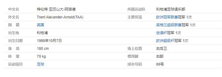 特伦特·亚历山大-阿诺德(Trent Alexander-Arnold),1998年10月7日出生于英格兰利物浦,英格兰足球运动员,场上司职右后卫,现效力于英格兰足球超级联赛的利物浦足球俱乐部。个人简介: