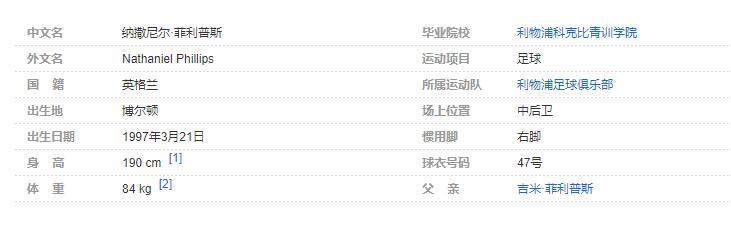 纳撒尼尔·菲利普斯(Nathaniel Phillips),纳撒尼尔·哈里·菲利普斯(Nathaniel Harry Phillips),1997年3月21日出生于英格兰博尔顿,英格兰足球运动员,场上司职中后卫,现效力于英格兰足球超级联赛的利物浦足球俱乐部。个人简介: