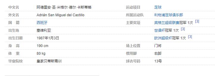 阿德里安·圣·米格尔·德尔·卡斯蒂略(Adrián San Miguel del Castillo),简称:阿德里安(Adrián),1987年1月3日出生于西班牙塞维利亚,西班牙足球运动员,场上司职门将,效力于英超的利物浦足球俱乐部。个人简介