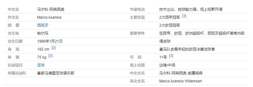 马尔科·阿森西奥(Marco Asensio),1996年1月21日出生于西班牙帕尔马,西班牙职业足球运动员,场上司职边锋/中场,惯用左脚,现效力于西甲皇家马德里足球俱乐部。