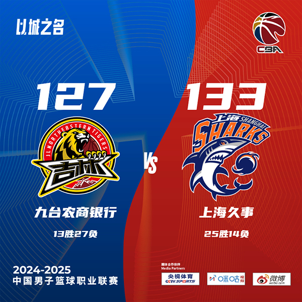 24直播网讯 北京时间3月14日中国男子篮球职业联赛 常规赛,九台农商银行对阵上海久事。半场吉林75-80上海,最终吉林127-133上海。九台农商银行多米尼克-琼斯30分12板14助,托马斯-基兹林克27分2板5助;上海久事洛夫顿29分13板13助,李添荣28分3板3助。
