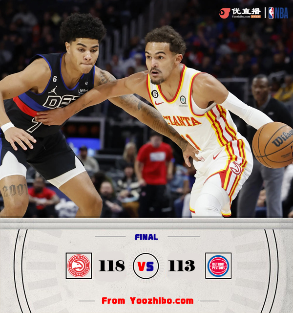 24直播网讯10月27日讯  NBA常规赛老鹰对阵活塞,老鹰上场比赛不敌黄蜂遭遇赛季首败,活塞则是最近遭遇3连败。上半场老鹰靠着亨特和特雷-杨两人的发挥取得领先,康宁汉姆状态不错联手博格达诺维奇努力追分,第二节老鹰手感有所下降,活塞在康宁汉姆的带领下迫近比分,上半场老鹰只领先1分。下半场回来活塞一度完成反超,但老鹰及时调整在特雷-杨的带领下夺回领先,最终老鹰118-113力克活塞。