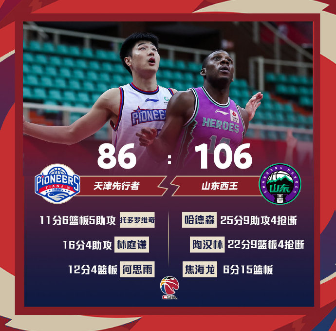 山东:哈德森25分9助攻4抢断2篮板、陶汉林22分9篮板4抢断2盖帽、贾诚13分2篮板2助攻、陈培东11分3篮板2助攻、王汝恒11分3篮板3助攻、侯沛佐7分6篮板2抢断、焦海龙6分15篮板2助攻2抢断