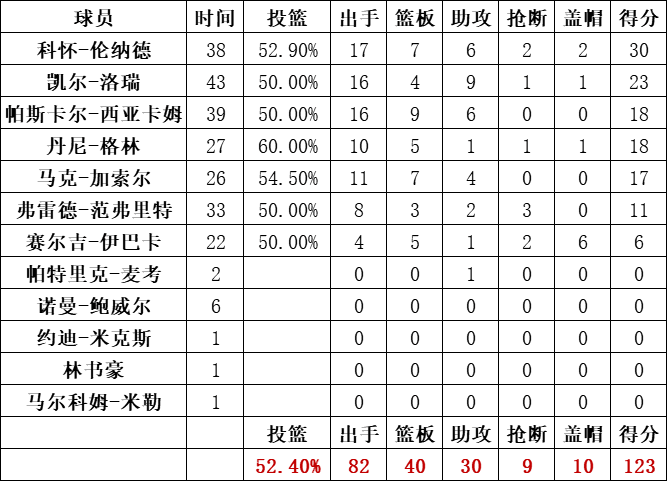猛龙队:莱昂纳德得到30分7篮板6助攻2抢断2盖帽,洛瑞23分8助攻,西亚卡姆16分9篮板6助攻,丹尼-格林18分,马克-加索尔17分,伊巴卡6分6盖帽,范弗利特11分。