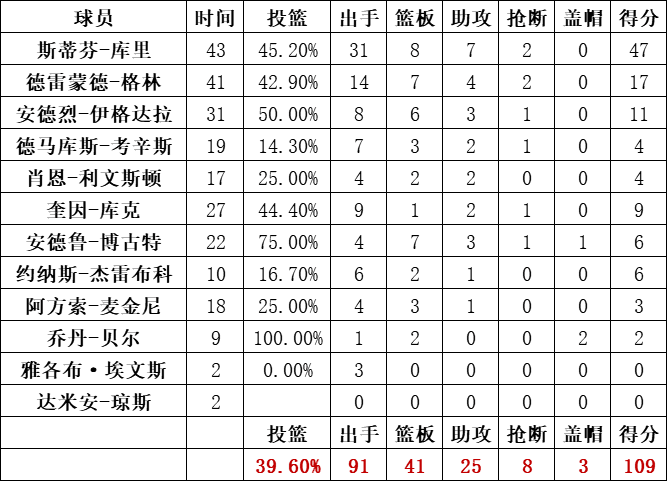勇士队:库里得到职业生涯新高的47分,另有8篮板7助攻,德雷蒙德-格林17分7篮板,伊戈达拉11分,库克9分。