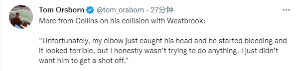 赛后科林斯回应肘击威少事件,他表示:我并没有想打威少的头部,当时我被威少的假动作晃起来了,在那种情况下,最坏的结果就是被他打成2+1,所以,我只是想打到威少的手臂,不让他把球打进;不幸的是,我的肘部正好碰到了他的头,他开始流血,看起来很糟糕,但老实说,我什么都没做。我只是不想让他出手。