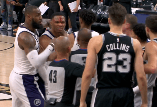 在湖人和马刺比赛中,第三节科林斯因在防守时肘击到威少的脑袋引冲突,威少的脑袋被打出血,站起来就要揍科林斯,所幸詹姆斯第一时间抱住威少,最终科林斯吃到二级恶意犯规被驱逐离场,威少爆粗想揍人吃到技犯。