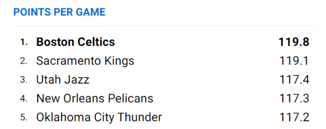 本赛季的绿军,有机会成为史上进攻最高效的球队。他们场均能得到119.8分,排名联盟第一,场均命中16.4个三分球,同样是联盟第一。进攻效率(119.0)、百回合效率差(+7.6)、助攻失误比(2.04)、有效命中率(58.2%)、真实命中率(62%)、中投命中率(49.7%)也都排在联盟第一。