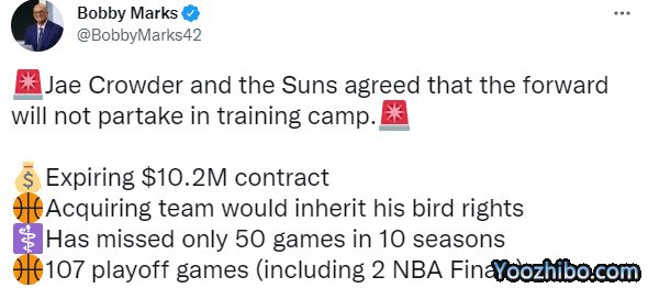 克劳德的太阳生涯正式倒计时,预计他很快会被交易离队,薪资专家Bobby Marks发推写道:即将到期的1020万美元合同,交易得到克劳德的球队将得到他的鸟权,10个赛季仅仅缺席50场比赛,107场季后赛(包括两次总决赛)