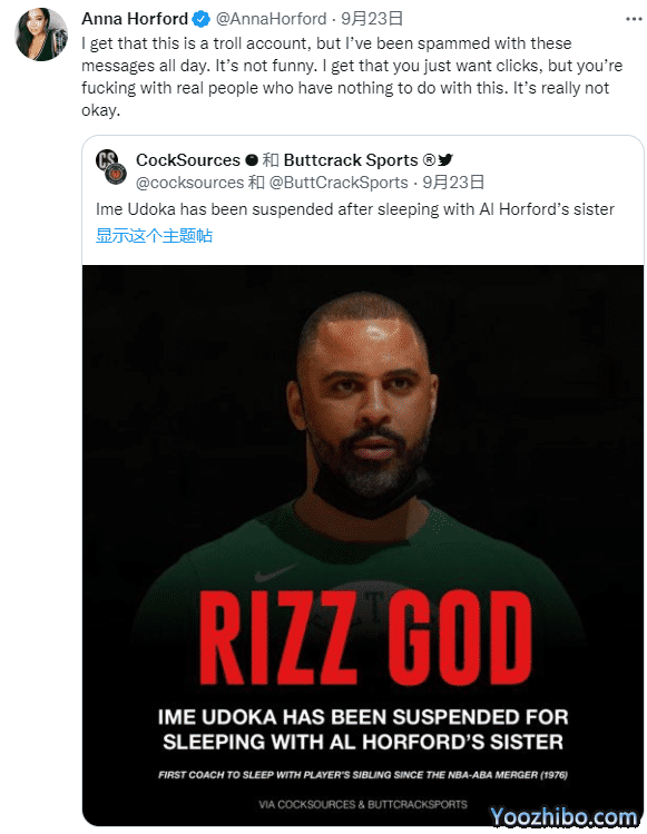 霍福德的妹妹安娜-霍福德自证清白,发推写道:我知道那就是一个挑事儿的账号,但我几乎一整天都在收到与此有关的骚扰邮件。这一点儿也不好笑,我知道你们想要流量,但我他TM的跟这件事没有任何关系,不能这么干,懂吗?”