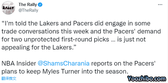 shams在节目中表示:我被告知,湖人和步行者本周的确进行了一些交易探讨,在任何涉及巴迪-希尔德和迈尔斯-特纳的交易中,步行者都索要两个无保护首轮签,他们在整个夏休期的立场都没变,湖人不愿意在这笔交易中付出两个首轮签。