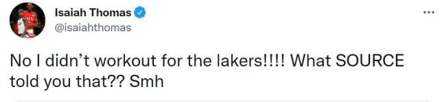 24直播网09月18日据NBA名记Michael Scotto报道,湖人试训了多位自由球员,其中包括沙巴兹-穆罕默德、杰里米-兰姆、德维恩-培根、米耶-奥尼、小托马斯、阿莫尼-布鲁克斯、沙里夫-库珀和米查尔-穆尔德。毫无疑问,两届全明星小托马斯是名气最大的球员,穆尔德是勇士旧将,兰姆的实力也很出色。小托马斯第一时间辟谣,表示自己并未为湖人试训。他写道:“不,我没有为湖人试训!!!哪个消息源告诉你的?”
