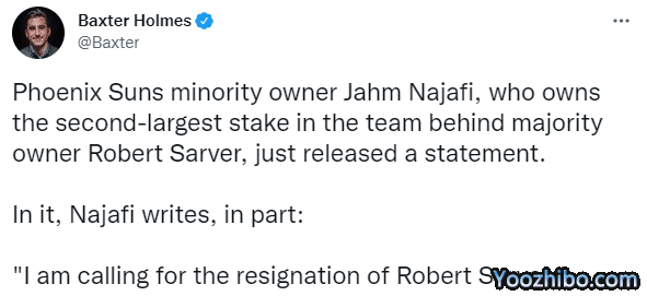 贾姆-纳杰菲还表示:作为菲尼克斯太阳队的副主席,我呼吁罗伯特-萨弗主动辞职。尽管我无意管理球队,我仍会努力确保他的继任者能够更加专业,给予各位股东尊严与尊重。