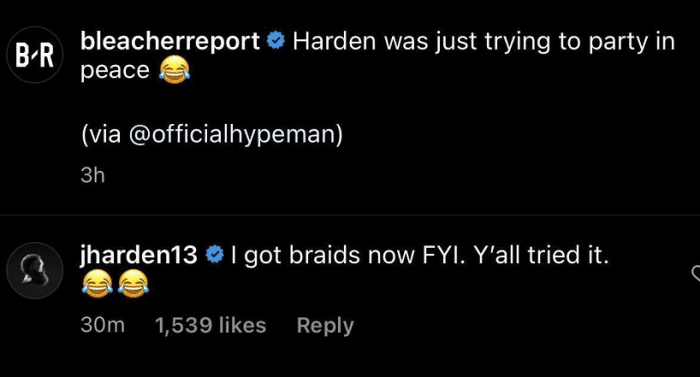 哈登努力训练,也打破了一些质疑,因为赛场上表现不佳,总是有一些媒体盯着哈登,给他造谣,制造话题。这其中就包括了BR,BR在社交媒体上发布了一个哈登在人群里舞动的视频,让人以为是哈登最新的动态,同时配文:“哈登现在只想安心玩乐。”