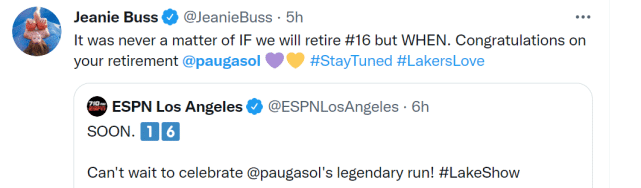 湖人已经决定退役加索尔的16号球衣,遗憾的是科比不能见证他所提到的“很棒的夜晚”了。湖人女老板珍妮-巴斯也在社媒上发声:“退役16号球衣,从来不是一个‘是否’的问题,而是一个‘何时’的问题,祝贺你正式退役,@保罗-加索尔!”