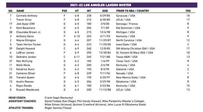 湖人队季前赛大名单——6号詹姆斯、3号浓眉、0号威少、7号安东尼、1号阿里扎、17号阿雅伊(双向)、9号贝兹莫尔、38号布朗、2号艾灵顿、5号塔克、39号霍华德、10号小乔丹、37号麦克劳林、11号蒙克、12号纳恩、21号奥利弗、20号奎恩、15号里夫斯和4号朗多。