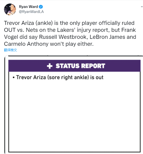 湖人官方还公布季前赛揭幕战伤病报告,阿里扎因右脚踝酸痛将缺席比赛,此前沃格尔透露詹姆斯、威少和安东尼也不会出战;湖人季前赛揭幕战对阵篮网,而篮网队多达7名主力缺阵,杜兰特、哈登和欧文三巨头都不打;湖人巨星浓眉将会打第一节,由于太长时间不打比赛,他太想重返赛场。