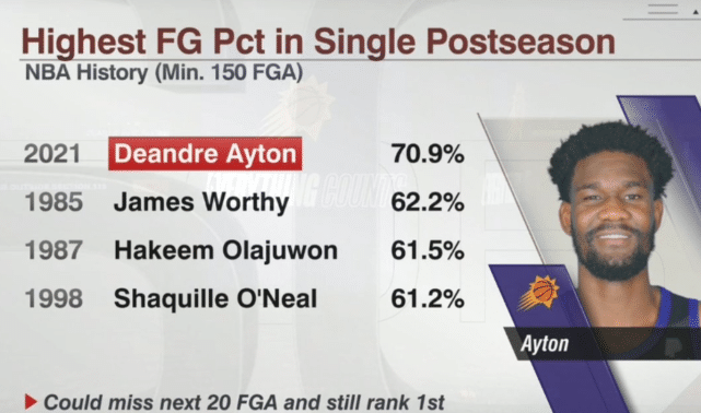 虽然艾顿今年是首次参加季后赛,但他的数据绝对可以说是现象级的,场均送出16.6分11.4板,最恐怕在于他的投篮命中率高达70.9%!据统计,在单个季后赛至少出手150次的球员中,艾顿70.9%的命中率高居NBA历史第一,比第二名的詹姆斯沃西足足高出8.7个百分点,就连1998年巅峰时期的奥尼尔也不过61.2%,艾顿这命中率完全是独一档的存在。