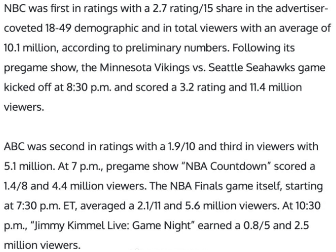 值得一提的是NBA历史上总决赛收视率最低的是去年,上个赛季的封闭园区,10月份进行总决赛,湖人4-2热火拿下队史第17冠,因为时间、悬念等原因,6场比赛的收视率没有一场超过800万,最高的是G4的754万,最低的是G3收视率408万,甚至湖人冠军加冕的G6,也只有560万。这样的收视率是什么概念?上个赛季之前,总决赛最低的是03年马刺VS篮网的单场802万和07年马刺骑士的921万。
