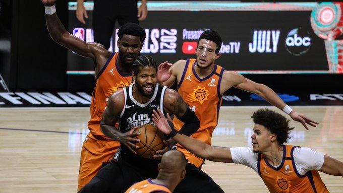 太阳14-2之后突然断电,乔治投进三分球,小莫和祖巴茨助快船回应7-小高潮;不过保罗下场休息后,布克带队6-0强势回应,再次打停快船;暂停回来,乔治突破得分止血,之后布克失误,乔治持球反击,上篮时被布克犯规,乔治重摔倒地,和布克有些小摩擦,乔治推开布克吃到技术犯规。