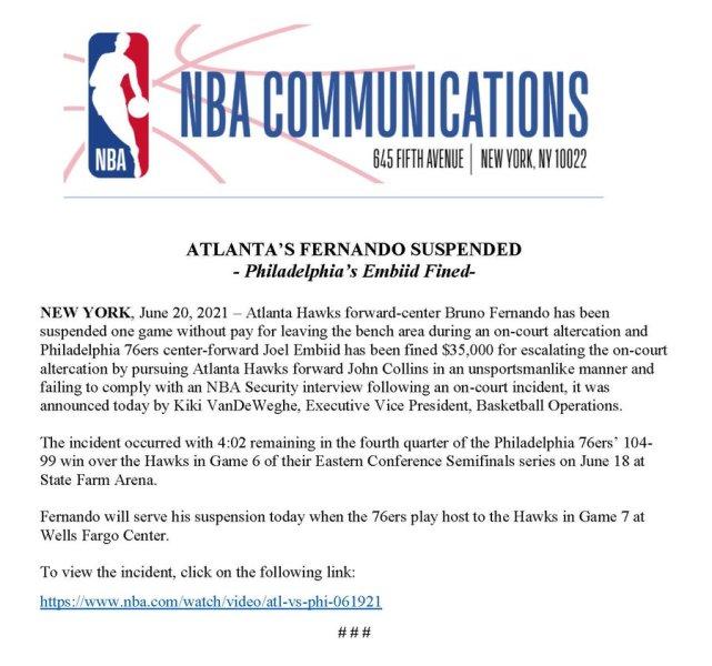 来源:24直播网06-21 10:2424直播网讯 北京时间6月21日,NBA官方宣布,在东部半决赛的第6场比赛中,费城中锋乔尔-恩比德因为升级了和老鹰前锋科林斯的冲突,遭到35000美元的罚款。