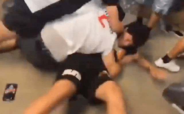 2打1倒是让快船队的球迷占据了领先,不过这也彻底激怒了太阳队的球迷团,要知道这可是太阳队的主场,很快这两名快船队球迷被太阳队球迷淹没,被摁在地板上摩擦和暴打,所幸的是球场的工作人员及时赶到,解救了这两个可怜的球迷。