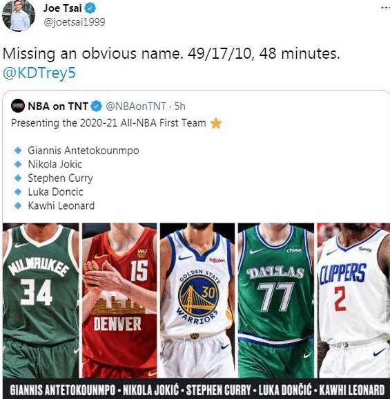 很显然篮网老板蔡崇信说的是今天出战48分钟,砍下超级数据的杜兰特,他也在配文中提到了杜兰特。这次的赛季最佳阵容评选,杜兰特并未入选最佳阵容,但是在季后赛的表现不逊色于任何入选最佳阵容的球员,这点是毫无疑问的。