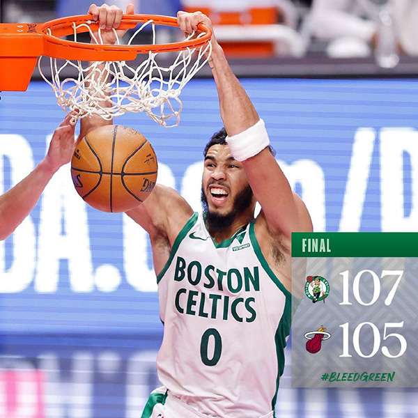 末节,阿德巴约在开始后连进两球,热火队再次领跑。凯尔特人队连拿4分追平,之后两队互有攻守,比赛领先权多次易主,巴特勒连投带罚拿下4分,第四节过半时热火队以93-90领先。布朗和塔图姆这之后一同开火,他们联手命中3个三分球率队打出13-0的反击高潮,第四节还有1分15秒时凯尔特人队以105-95反超。