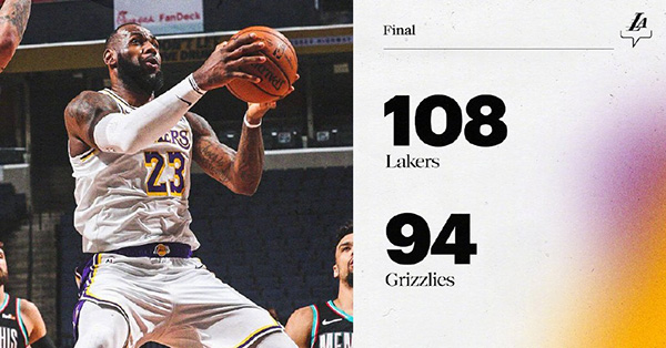 NBA简报:湖人108-94轻取灰熊 詹姆斯22+13+8