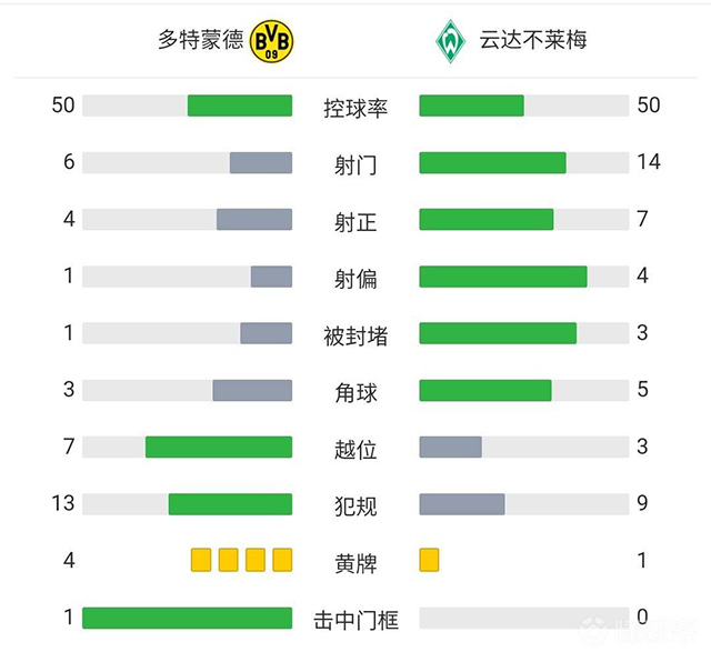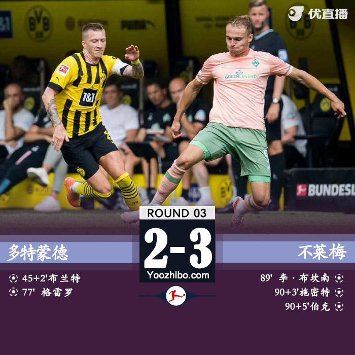全场比赛结束,多特蒙德2-3不莱梅。