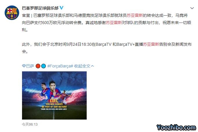 巴萨将当地时间在9月24日中午为苏亚雷斯举办告别仪式与发布会。