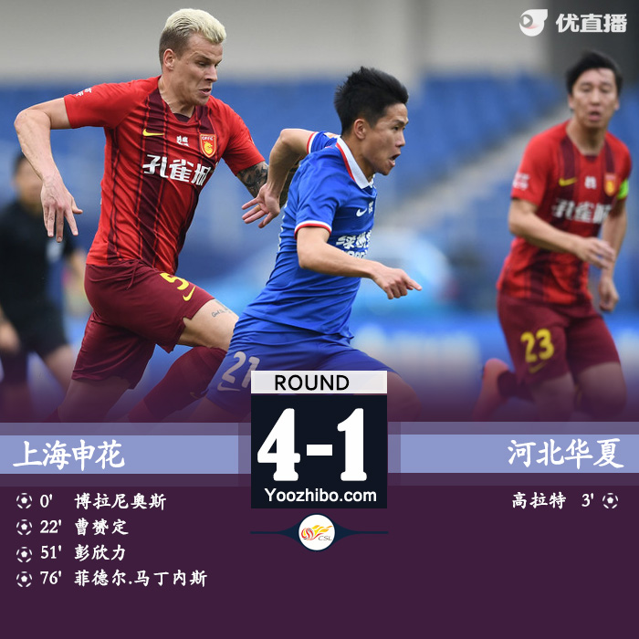 24直播网讯:11月6日,中超联赛7-8名排位赛,上海申花对阵河北华夏幸福,博拉尼奥斯推射破门打破僵局,高拉特迅速扳平;随后曹赟定射门造成对方乌龙球,下半场彭欣力打进世界波,随后于汉超造点马丁斯命中,申花4-1华夏幸福。