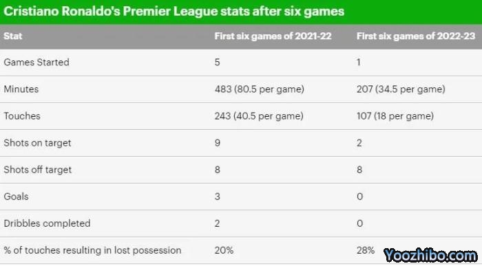 事实是否如此仍可以争辩,但不可否认的是,因为缺席了季前赛,C罗目前的身体状况没有达到理想水平,状态不佳,这是不争的现实。本赛季6场英超比赛中,C罗的表现没有达到去年同期的水准。上赛季C罗在参与的前6轮英超比赛中,5次首发,平均每场能踢80.5分钟,触球40.5次,射正9次,打入3球,完成2次突破,控球失误率为20%。而本赛季,C罗场均仅出场34.5分钟,触球18次,仅有2次射正,没有进球和突破,失误率提升到了28%。这表明C罗在场上时并没有把握住机会,没有展示出上赛季的得分效率,而能够进球恰是过去使C罗成为场上最重要球员的关键。葡萄牙人越来越老,即便他多么努力,多有斗志,也无法抵御时间的侵袭,这是生命的定律。