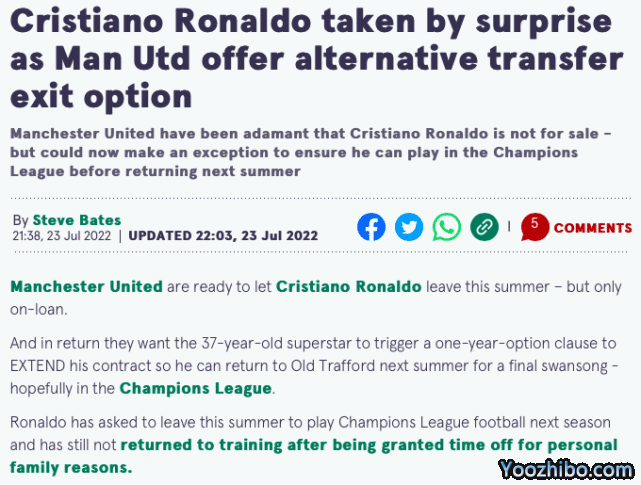 来源:24直播网07-24 11:3624直播网07月24日讯 ,来自英国知名媒体《每日镜报》的独家消息,曼联俱乐部决定选择妥协,同意放C罗离队。不过曼联放行C罗也是有条件的,那就是C罗必须先续约1年,然后以租借的方式离队,明年夏天再回归曼联。